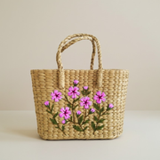 Handmade Woven Wooden Handbag with Pink Blossom Embroidery